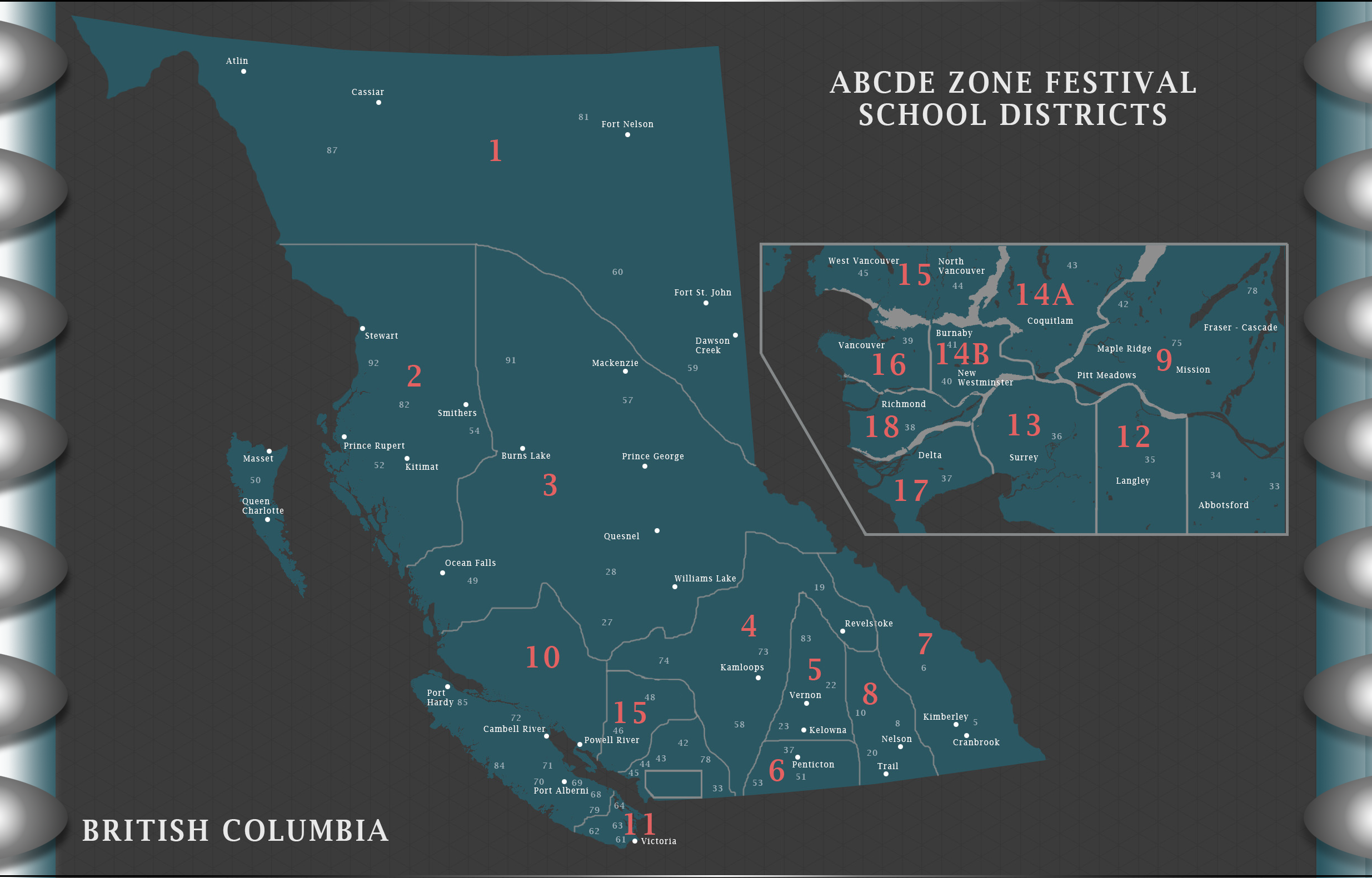 OVERVIEWBelow you will find the school districts within each ABCDE Drama Zone and their Zone Rep. If you would like to get involved in your Zone’s Drama Festival, or are interested in having a festival in your zone, please contact your Zone Rep. or Sharon Conrad, Zone & Provincial Drama Festival Liaison at theatre.garden@yahoo.ca |